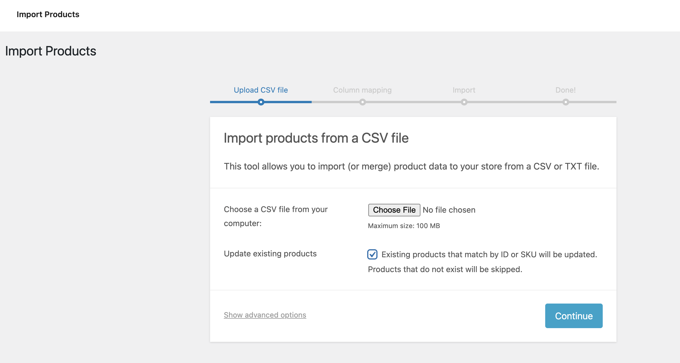 4 – Click on import button and follow instructions. Ensure that “update existing products” is checked.